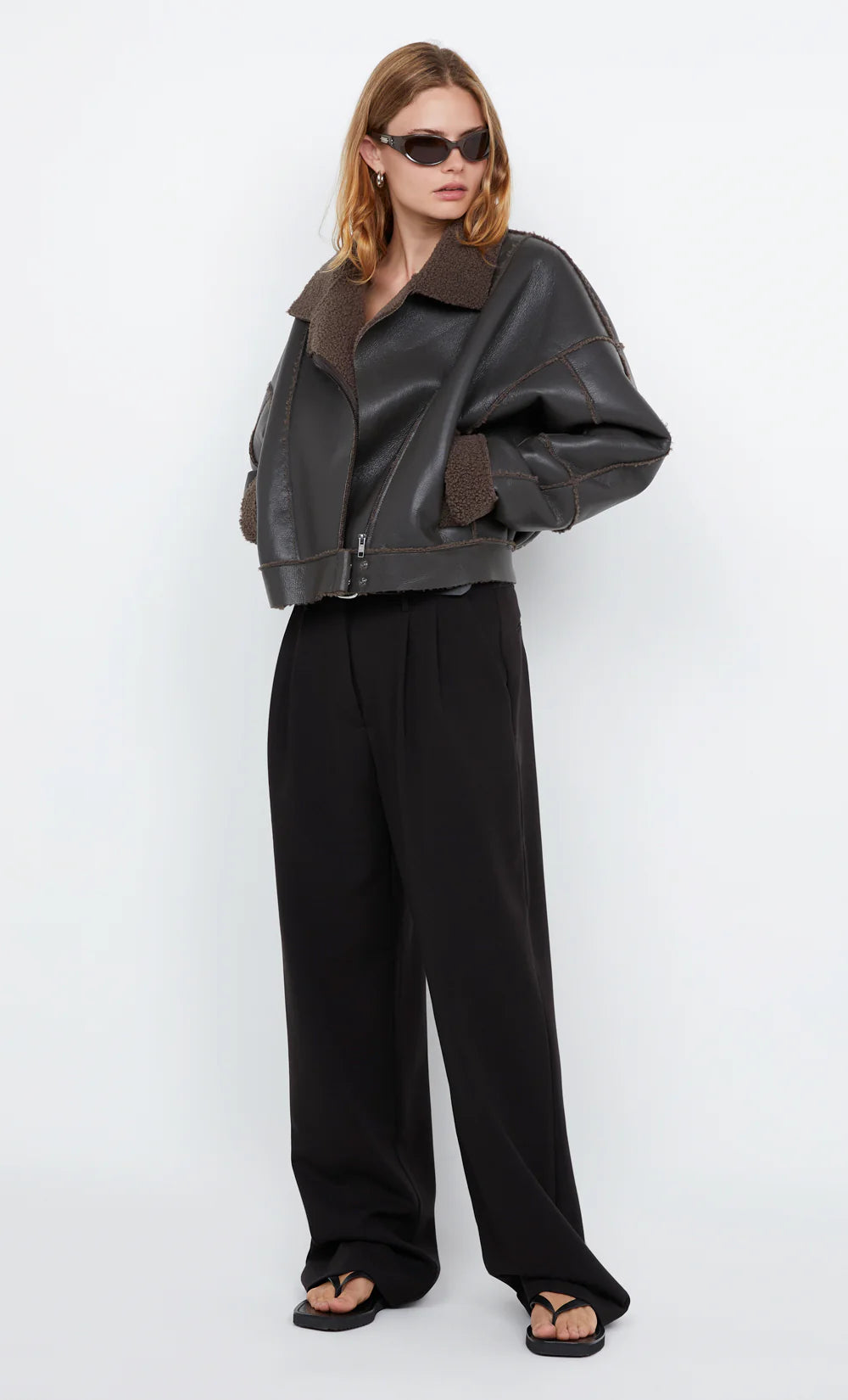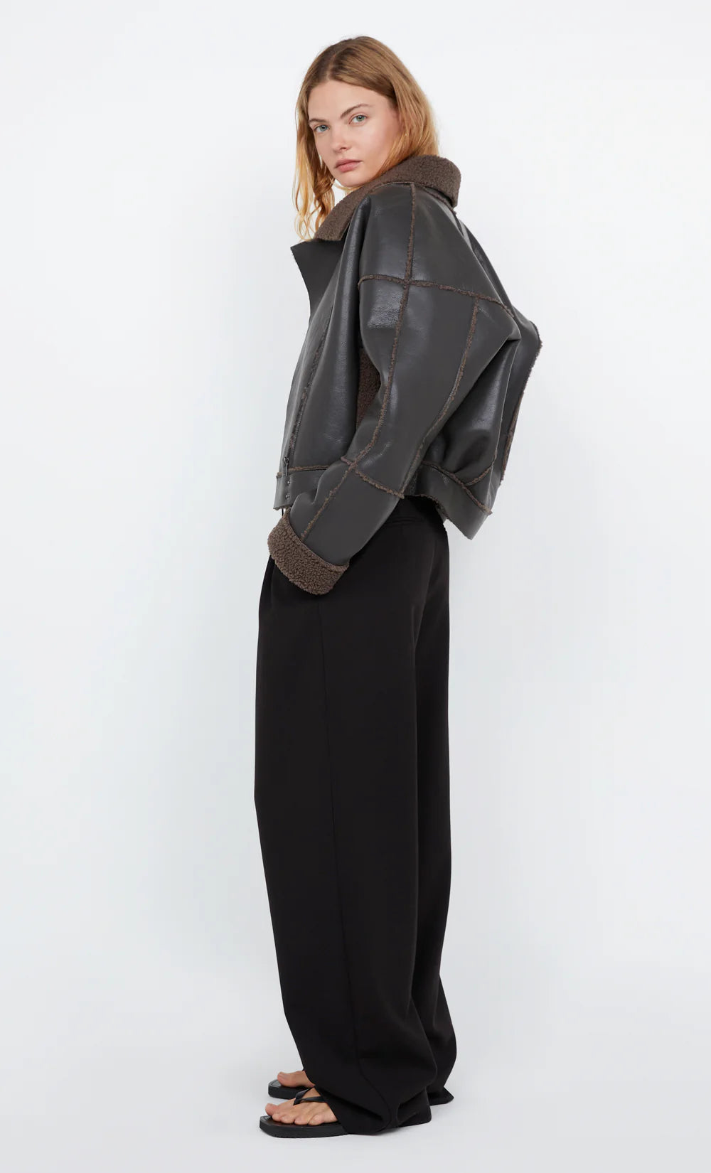 The BEC + BRIDGE Asha Bomber Jacket in Dark Chocolate is a bold outerwear piece designed to make a statement. Crafted from soft PU shearling, this jacket features raw panel seams that expose the shearling for an edgy, textured finish. The asymmetrical lapel and metal zipper closure give it a modern, rebellious vibe, while the boxy, relaxed fit offers a laid-back yet stylish silhouette. Perfect for layering, this bomber combines contemporary design with the warmth and comfort of shearling.