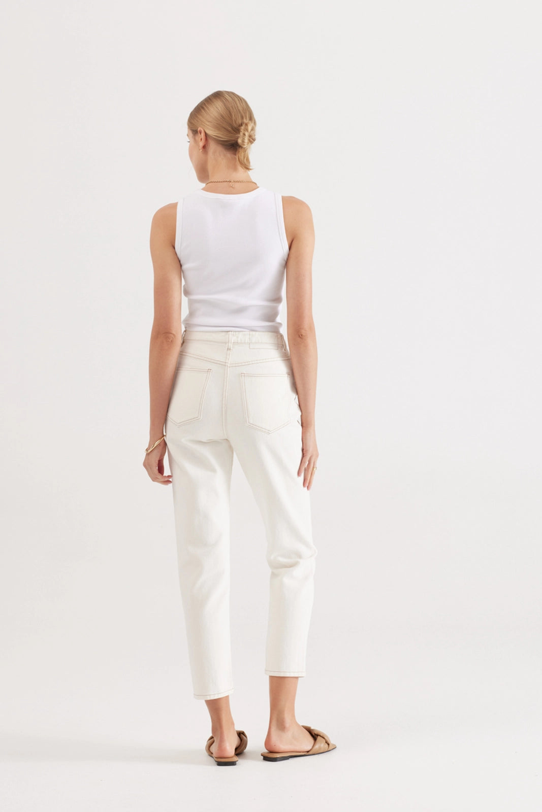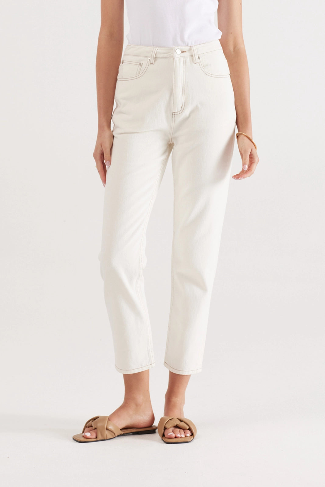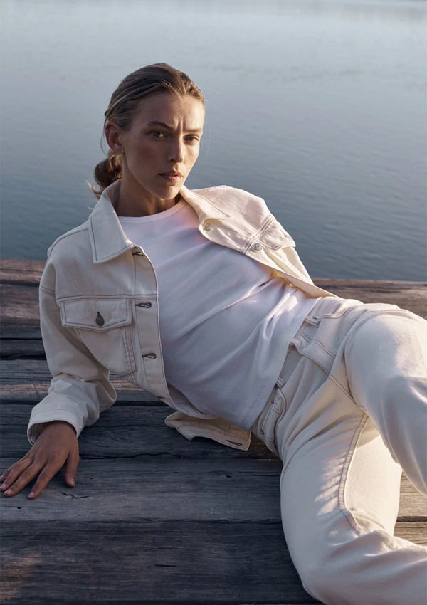 Outfit with ease with our go to Veronica Jean in a fresh Ivory denim with contrast stitching. Style up with statement jacketing or knitwear and a chunky boot, or pair back with our matching Veronica Jacket for a casual yet cool look. Cut in a rigid denim with a high waist and tapered leg silhouette, this jean skims the ankle, it has all the classic five pocket jean styling.