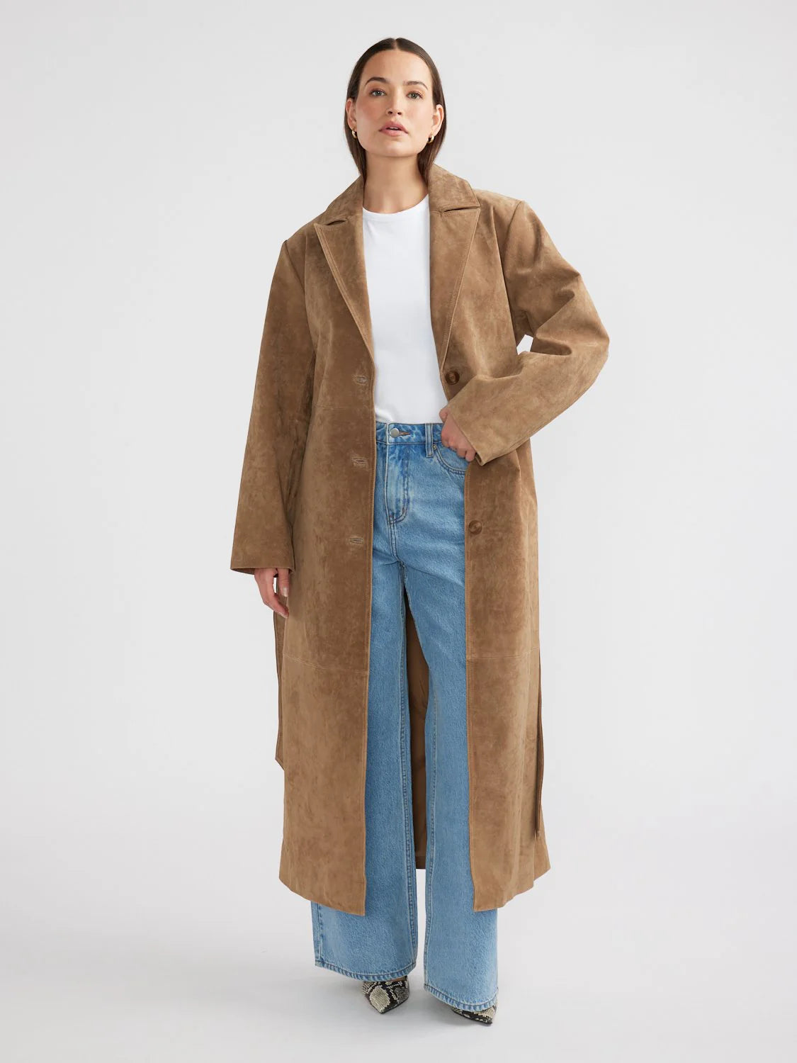 The Miley Suede Trench from Ena Pelly is a belted longline coat crafted with precision for a relaxed fit and mid calf length, featuring a button front, collar and lapel, and a centre back split for ease of movement, Designed with practical front slant pockets and a lined interior for seamless comfort and functionality.