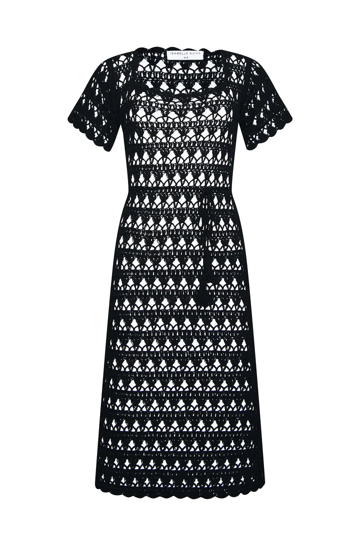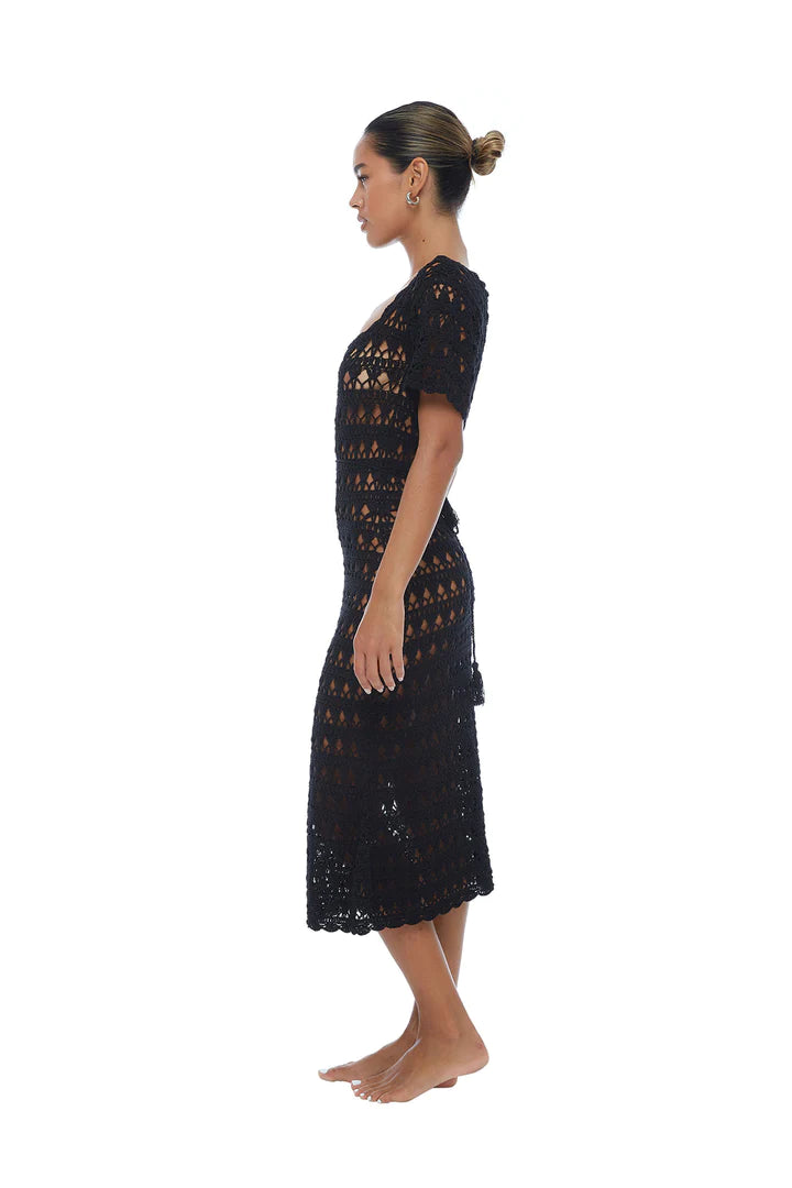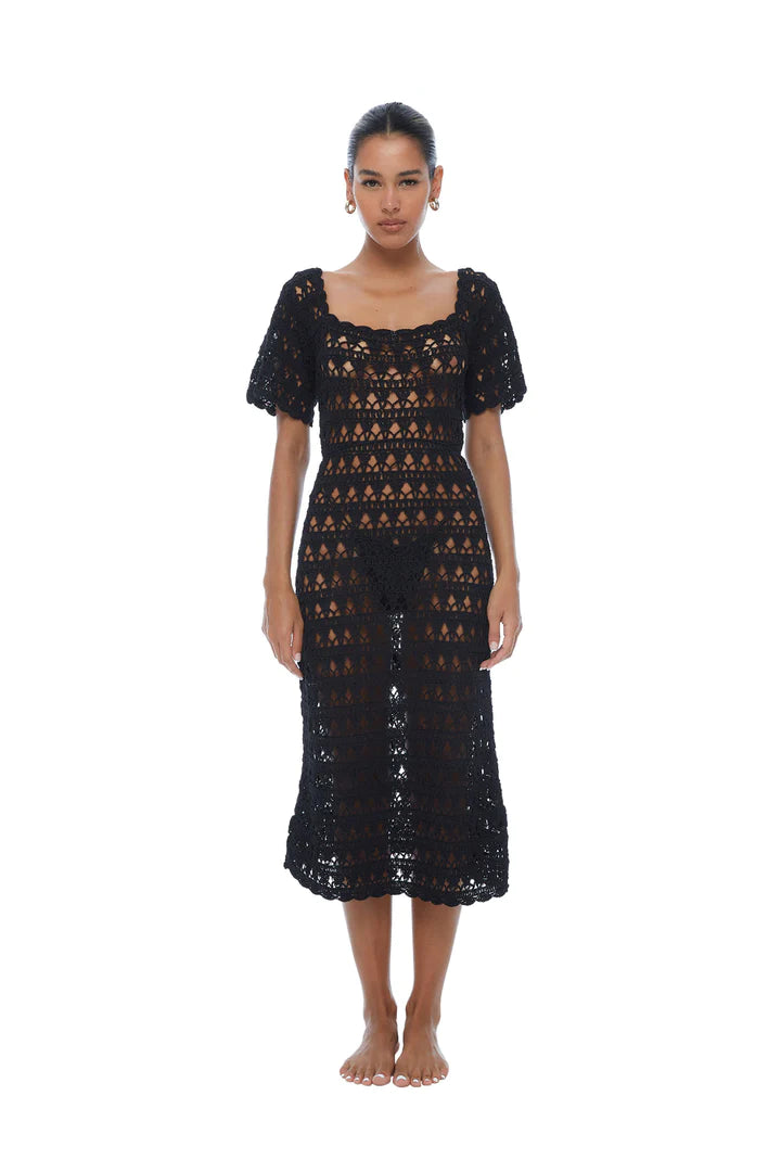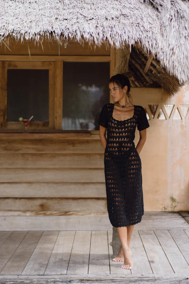 A Woman in a midi dress, speaks poetry. An old favourite back by popular demand; Sofia Noir - this time in a new crochet motif. With our signature wide-knit crochet and bell sleeves, you’re sure to feel like heaven walking. Wear over swim during the day or add a slip after dark.