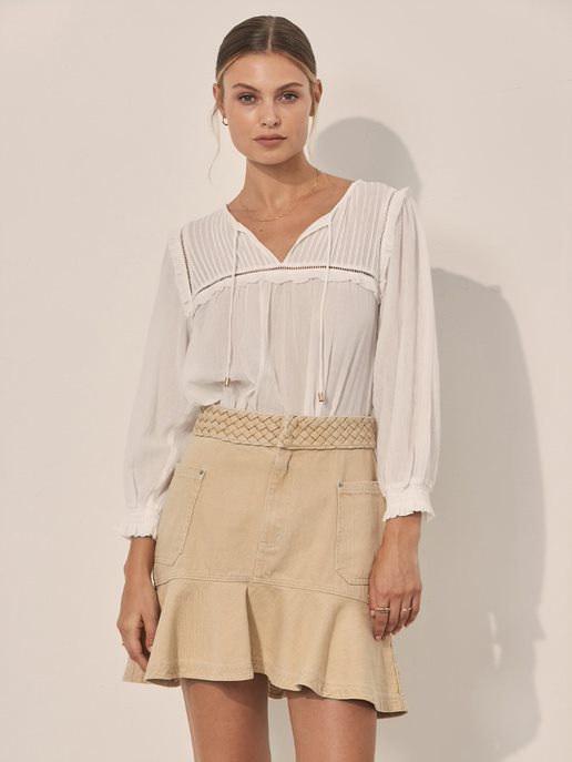 Shaped with a statement flare the Theo Mini Skirt is a KIVARI twist on the denim classic. Featuring a high rise silhouette with a feminine ruffle hem, a braided waistband and front pockets.