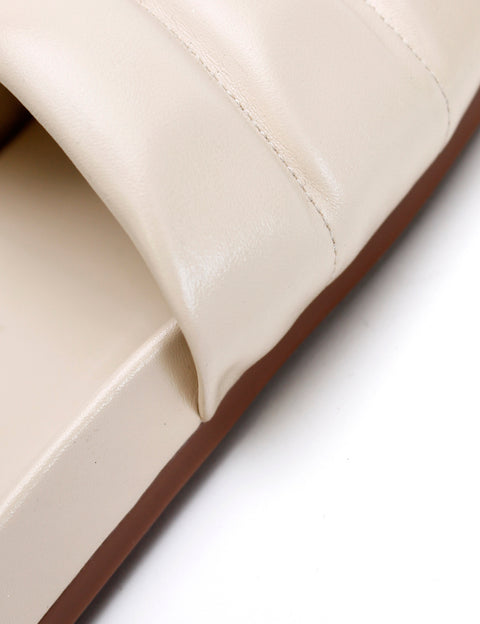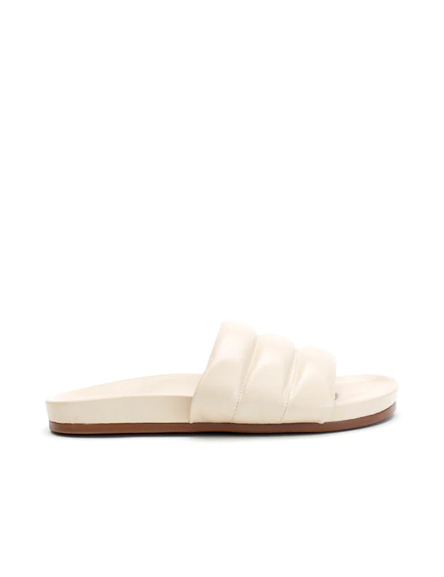 A quilted leather front strap sits on a moulded foot bed wrapped in durable leather, finished with a non- slip rubber sole. The ultimate in everyday luxury.