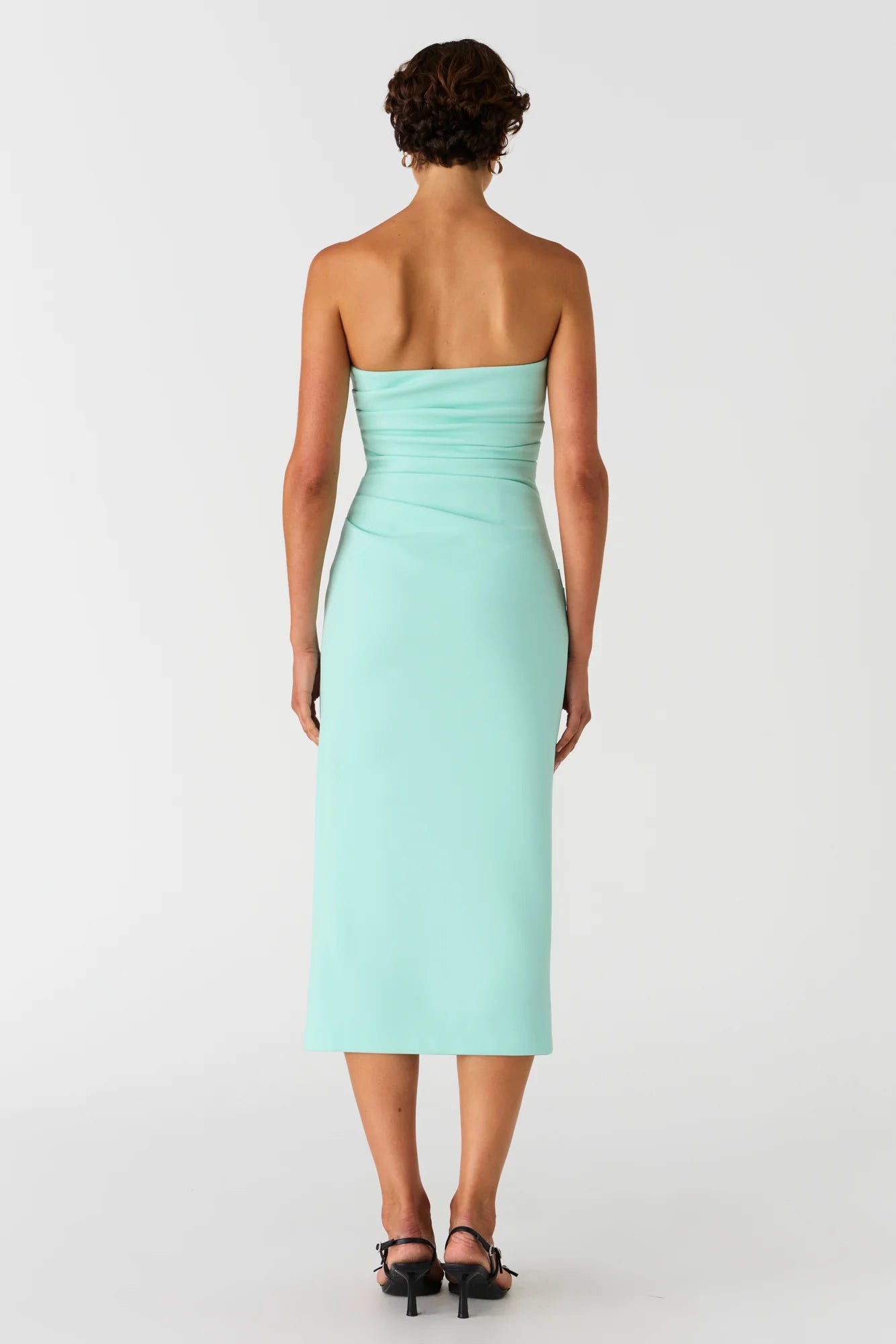 The Calandra is our modern take on the perfect 90’s strapless dress. Keep it elevated, but cool with strapless neckline, midi hemline and soft asymmetric tuck detail that flatters the figure.