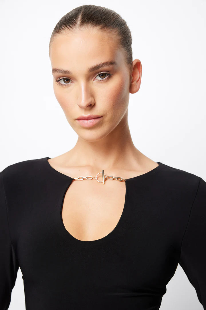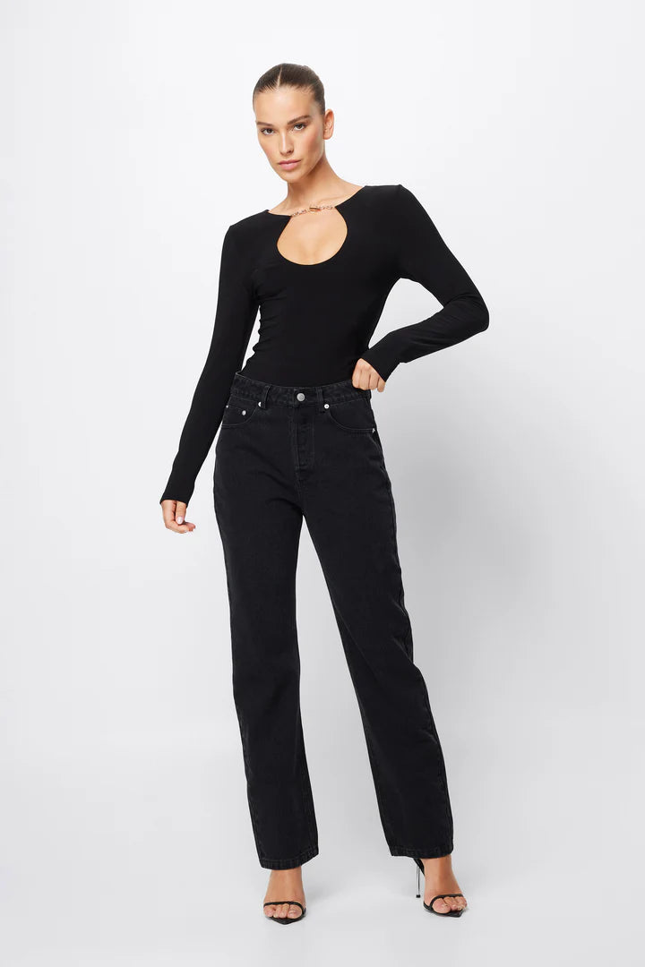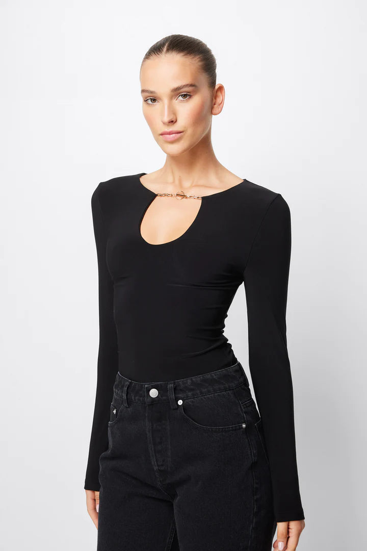 The Defiant Top in black is your new go-to evening wear. This jersey top features a cut-out neckline with a metal chain fastening and long sleeves. The fitted style allows for effortless styling whether worn tucked into high-waisted trousers or a midi skirt. Pair this with our Defiant Midi Skirt and Black heels for your next date night.