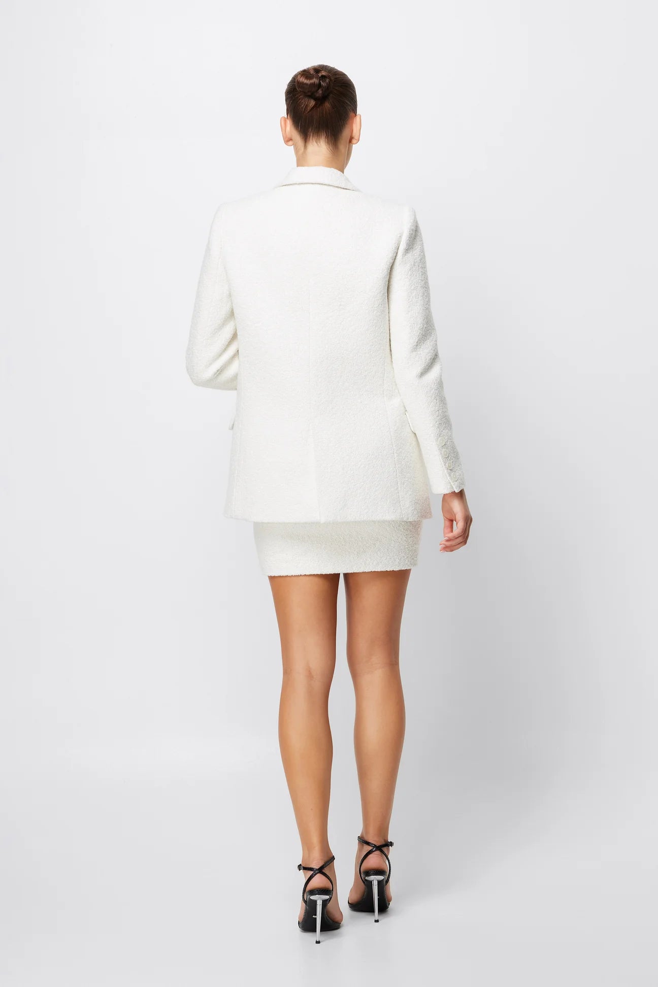 Crafted from a luxurious white bouclé fabric, the Motionless Blazer provides a tailored and polished look, perfect for a professional setting or a stylish night out. This Blazer is fully lined with functional pockets and white button detailing.
