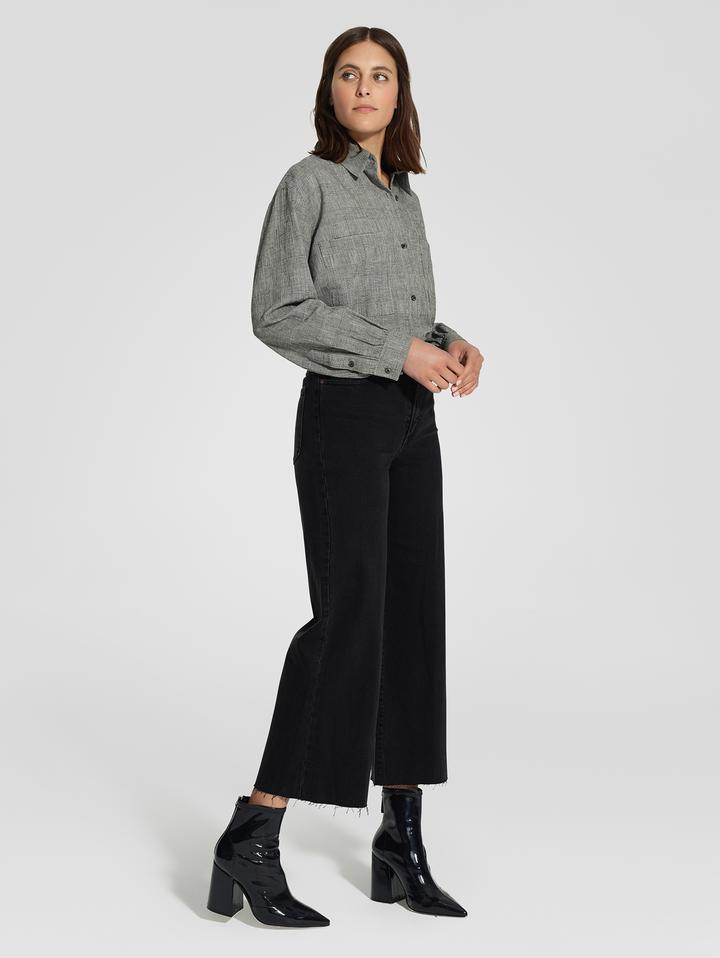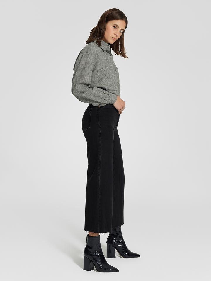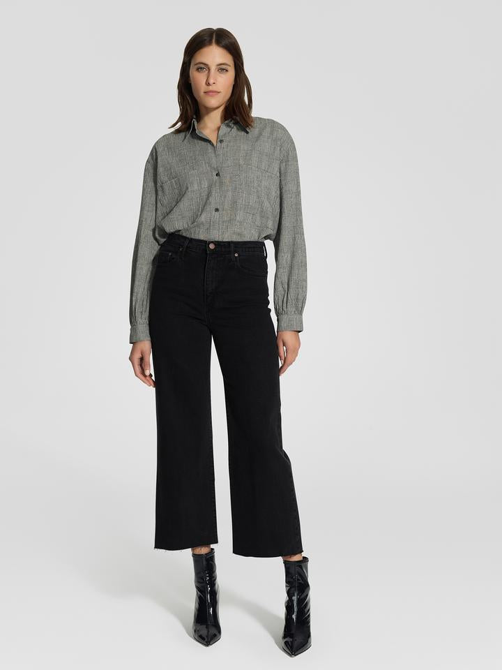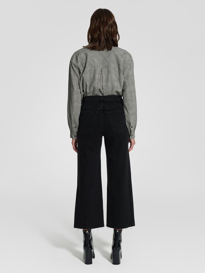 The ultimate in wide leg denim, a Super high rise that accentuates the waist, finishing with a ankle length inseam and raw hem. Perfectly pairs with any Luxe Rib or Fully fashion knit coordinate and ankle boots.