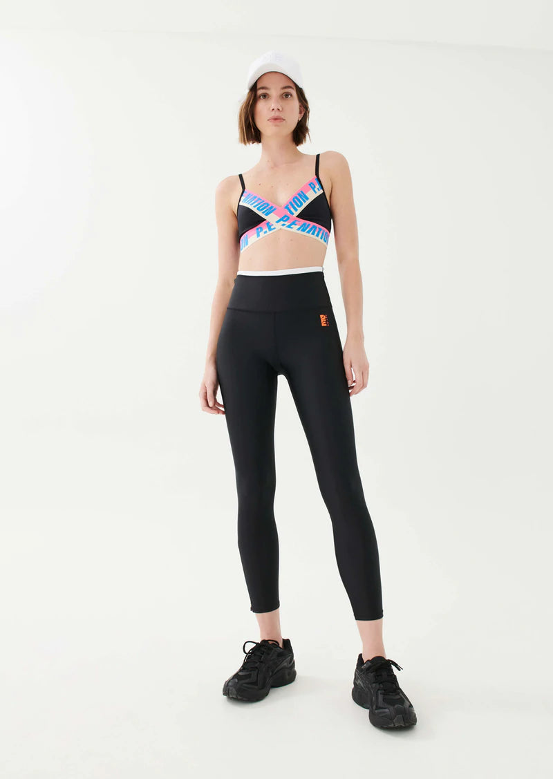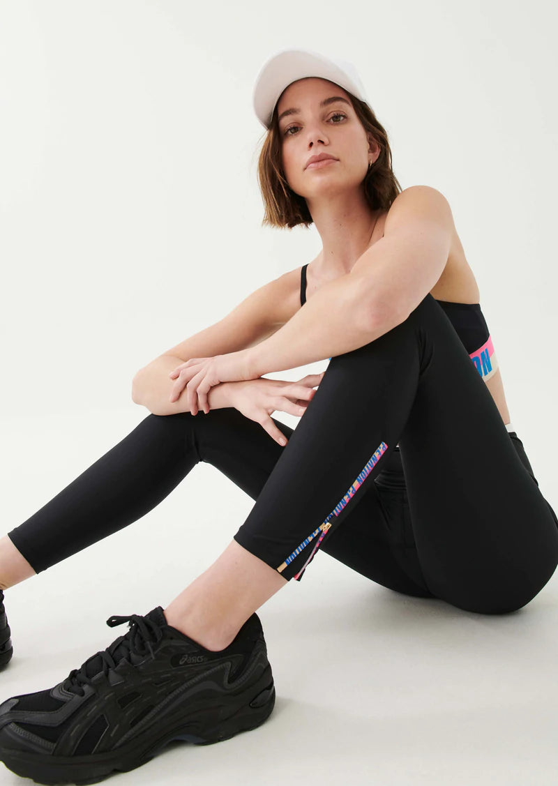 The Tiebreak Legging in Black comes as part of our Adventure Is An Attitude Collection. A high rise 7/8 length style in semi-matte sustainable performance fabrication, the Tiebreak Legging is designed for low to medium impact activity including yoga, Pilates and strength training sessions. Built-in waistband support keeps the legging in place as you move through your workout. A fluro P.E Nation logo sits at the hip, with fluro waterproof P.E Nation zippers at the back ankle cuffs adding further point of difference. Team them with the Half Volley Sports Bra or Half Volley LS Top.
