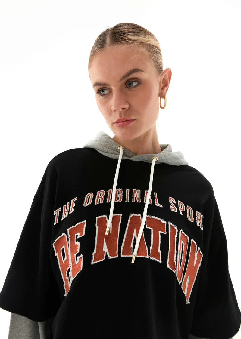 The Wondergoal Hoodie in Black from PE Nation is arelaxed fit hoodie, featuring a double layer silhouette with contrast hood and sleeves. Functional drawstrings in the hood feature gold metal hardware. A soft, medium weight organic cotton hoodie, the Wondergoal is complete with P.E Nation logo aplique at centre front.
