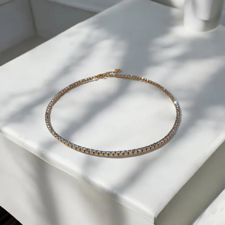 The 'Starlight' tennis necklace shines bright with delicate crystal details of rhinestones. It's a timeless piece you'll wear from sunrise to starry nights.