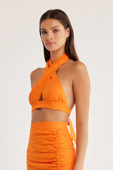 Cross front halter top with ties at back neck and body. Double layer in self. 100% Linen.