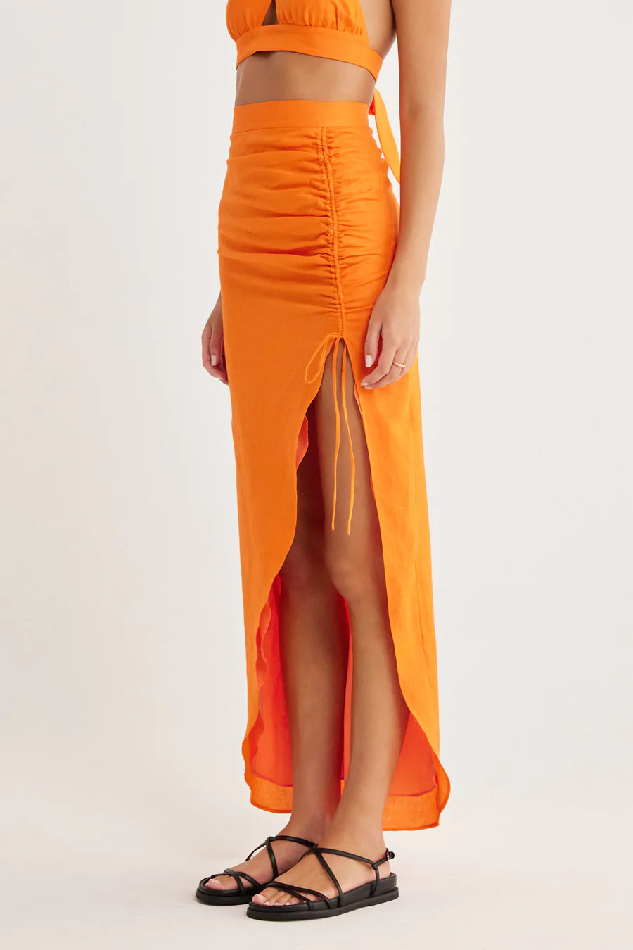 The Enigma Skirt in Orange is a high waisted maxi skirt with drawstring at side split and cut away front hem. We love this paired with the matching Enigma Crop for a bold Spring look.