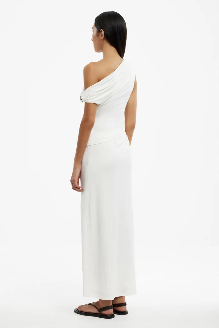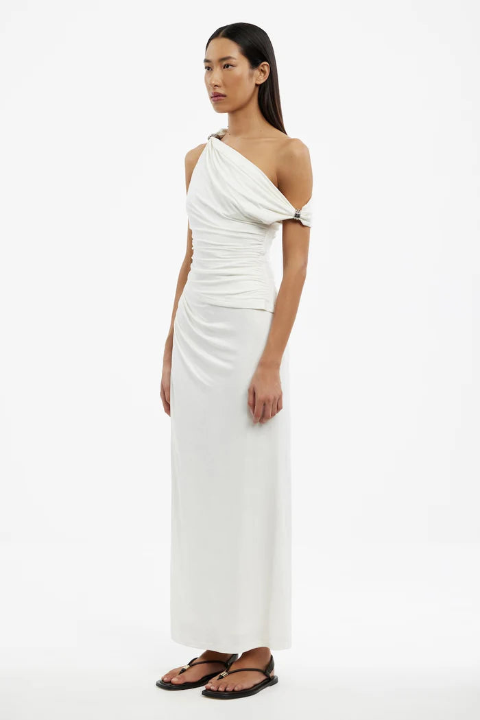 A modern design with unique finishes the Nala Top in Chalk is crafted from wet-look crinkle jersey for a sleek, textured finish. Featuring stacked ring hardware at each strap and an off-shoulder detail, this top embodies contemporary elegance. The asymmetrical hem and gathered front waist add a flattering silhouette, perfect for pairing with tailored pants or a statement skirt.