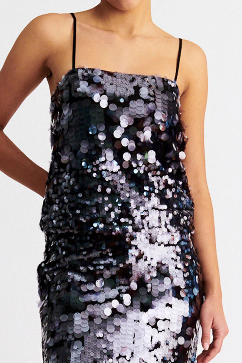 The Blake Camisole in Smoke Grey features transparent paillettes sequin fabrication and adjustable straps. We love this paired with your favourite denim for a night on the town.